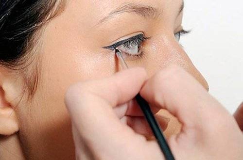 Особенностью глаз азиаток считается особая миндалевидная форма. Чтобы визуально приблизить европейские глаза к подобной форме, следует грамотно оформить нижнее веко. Приемов очень много, но наиболее эффективным является высветление. Для светлых глаз предпочтительно брать бело-розовый или светло-бежевый карандаш.