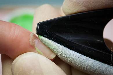 Работа с пальчиками начинается с удаления птеригия. С помощью пушера или апельсиновой палочки отодвигается кутикула, очищается плёнка. В ход идет узкая фреза, она подготавливает кутикулу, подготавливая ее к срезу. Щипчики тут выполняют главную роль. Они удаляют кутикулу, а также срезают кожу с боковых валиков.