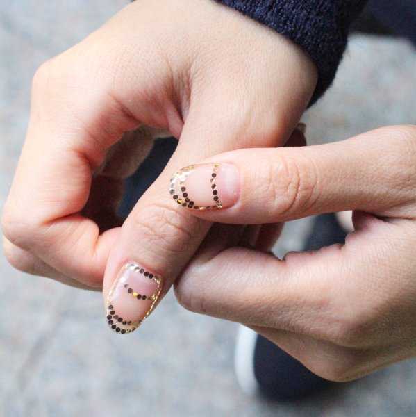 Линию на свободном крае ногтя можно прорисовать стразами или крупными пайетками. В один ряд и более — это зависит от площади свободного края ногтя и размера страз