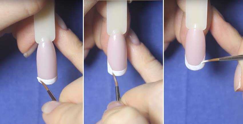 Если вы не знаете, как аккуратно сделать французский маникюр в домашних условиях с помощью гель-лака, можно использовать самые разные кисти. В этом варианте создания классического дизайна от руки нарисована полоска белой краской.