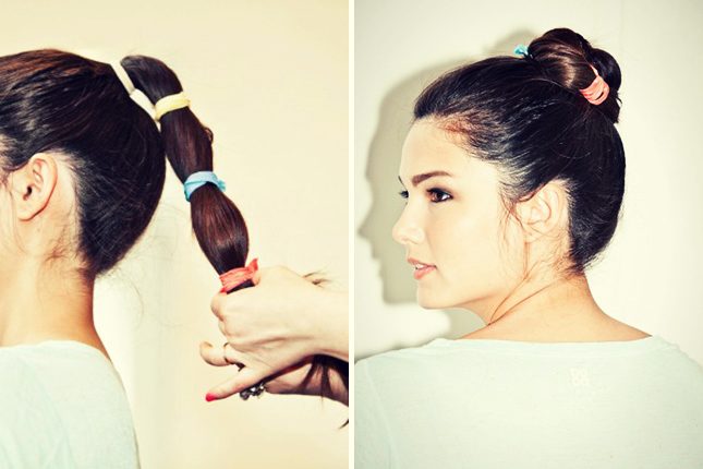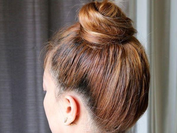 Пучок. Соберите волосы у основания головы, поверните и наденьте ластик, только не стягивайте волосы слишком сильно ведь это может привести к повреждению волосяных луковиц и даже к выпадению. Поэтому сделайте пучок более свободным он идеально подходит в качестве прически для менее динамичных занятий.
