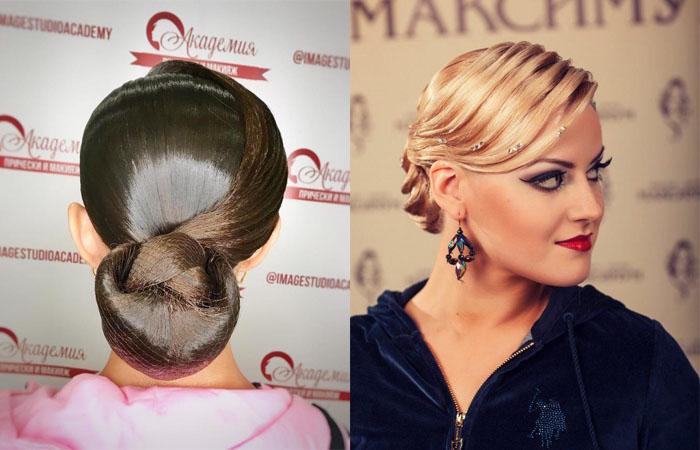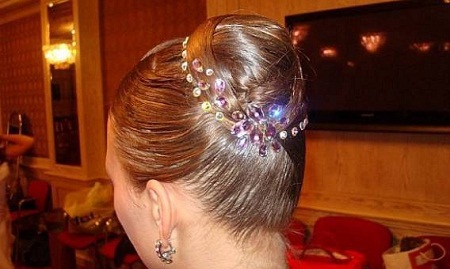 Для создания такой укладки завяжите тугой хвост. Чтобы пряди не ложились одна к одной и не мешали занятиям, предварительно нанесите на них гель для волос. Оберните волосы вокруг хвоста несколько раз и закрепите гульку шпильками и невидимками. Этот вариант прически для спортивных бальных танцев для девочек самый удобный и простой. Если длина ваших прядей ниже плеч, то для воплощения прически можно использовать специальную резинку – «бублик». С ее помощью пучок станет объемнее, будет красиво выглядеть и не помешает в исполнении танцевальных па.