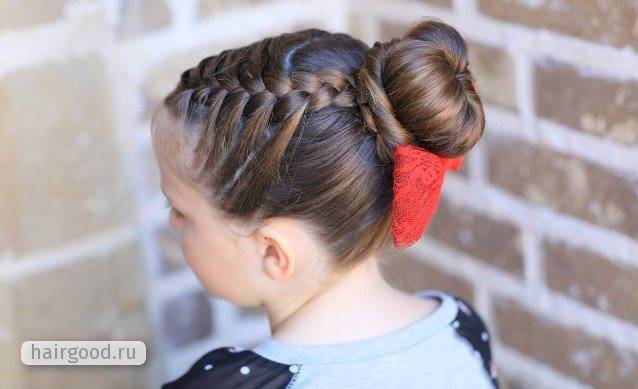 Собирается прическа по аналогии, как для взрослых, но пряди в конце можно заколоть шпильками с декором. Можно видоизменить шишку: отделить волосы на затылке и собрать в хвост, заплести французскую косу из них и прядей, оставшихся свободными на верхней части головы. По ходу плетения можно добавить белые ленты.