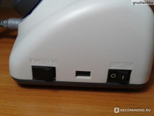 Справа находится кнопка переключения реверса, для тех кто не знает что такое реверс поясняю: реверс в аппарате для маникюра – это возможность вращения фрезы в аппарате в любую сторону, то есть фреза может вращаться как слева-направо, так и справа-налево. Это очень удобно, особенно если Вы левша. Также здесь находится кнопка включения/выключения аппарата.