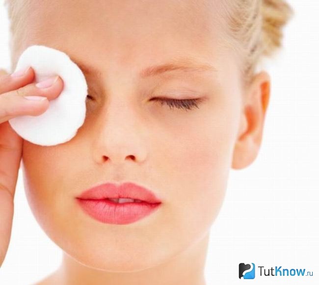 С глаз сначала смывают тени. Ватный диск ведется от внутреннего края к внешнему.
