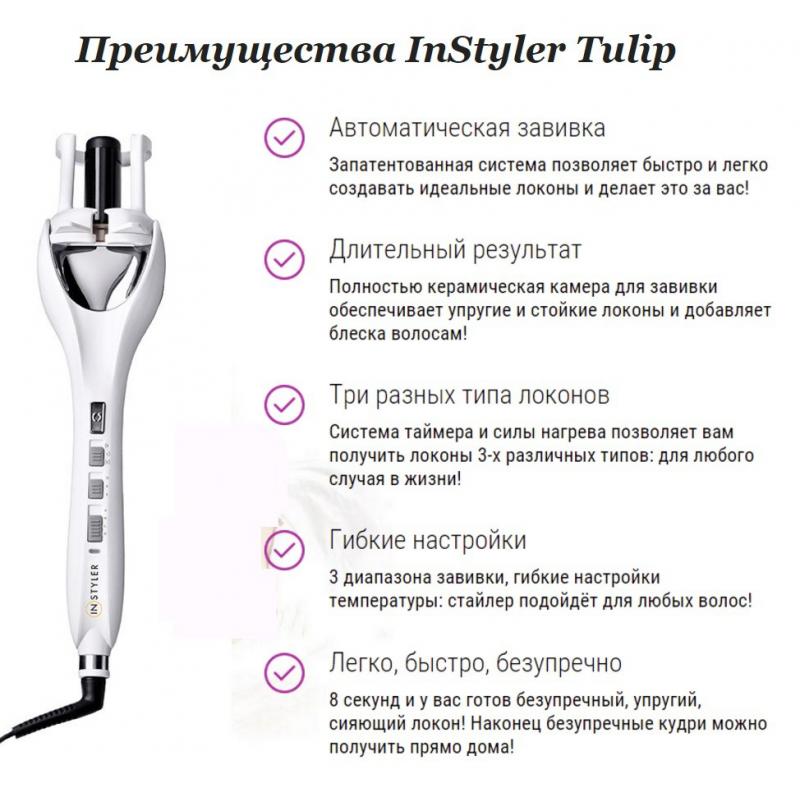 Автоматическая плойка Инстайлер Тьюлип обладает целым рядом преимуществ, которые выгодно отличают ее от других подобных устройств: