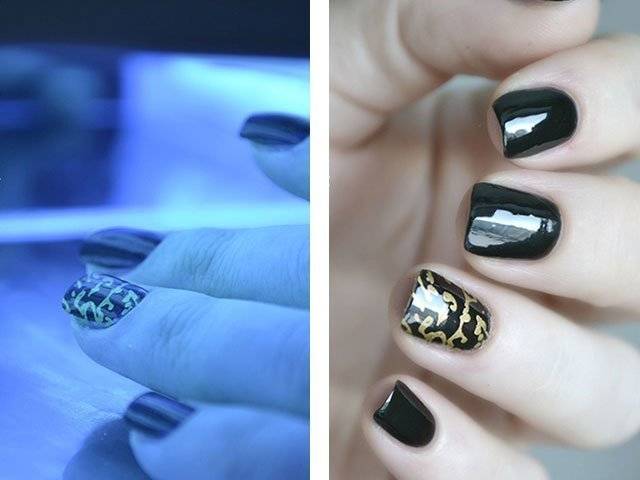 - После подсыхания базы золотая фольга снимается с основы и ровным слоем прикладывается к ногтю.