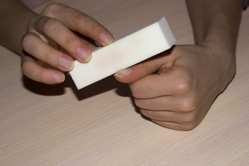 - Выступающие уголки пленки можно срезать пилкой, выполняя движения сверху вниз по кромке ногтя.