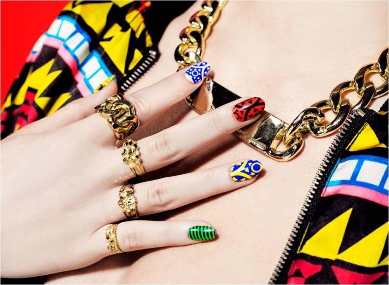 Стикеры могут быть как имитирующими своей формой ногти, так и просто разноцветные небольшие картинки, которые можно клеить на бесцветный или однотонный цветной лак. Первый вариант является musthave’ом этого сезона: на подиум выходили девушки, чьи ногти покрывала самоклеящаяся плёнка с эффектом металлик.