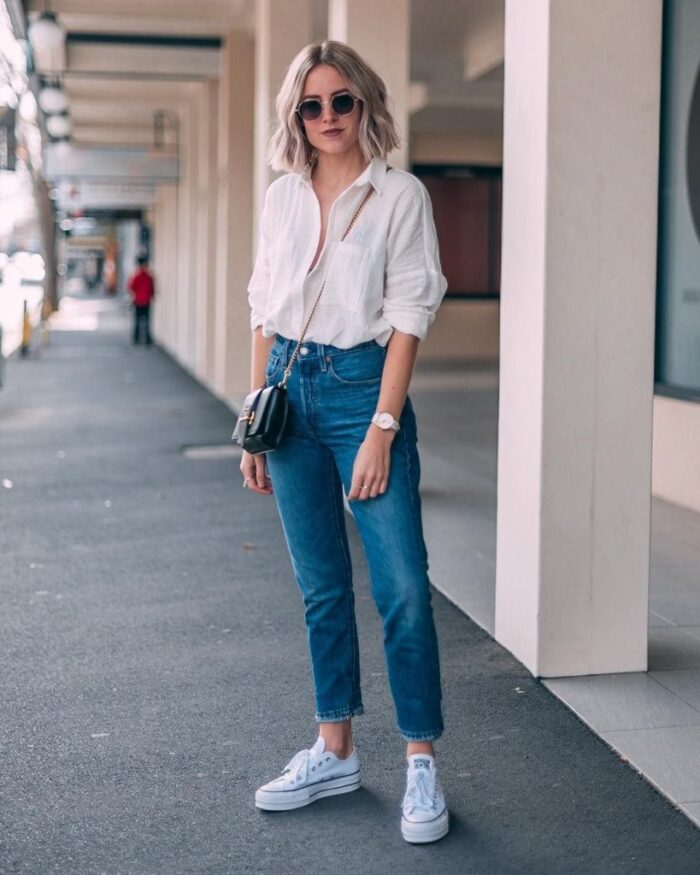 Практически любая блузка или топ с джинсами или шортами мгновенно вводит ваш наряд в пределы данного направления — вне зависимости от обуви. Если 15 лет назад надеть закрытые туфли на каблуке с джинсами считалось дурным тоном, сегодня это норма.
