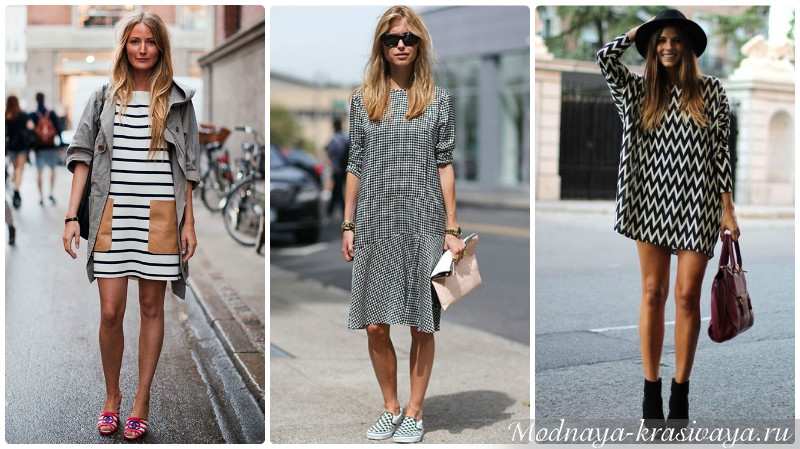 - Кэжуал-платья – самые разные фасоны и длина. К этой повседневной категории смело можно отнести все, кроме классических вечерних нарядов: комфортные легкие летние платья из натуральных тканей, платья-рубашки, платья-футляры и, конечно, платье-мешок!