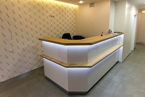 Световое выделение уместно не всегда, но, например, в помещениях с темным цветовым решением поможет акцентировать внимание на ресепшен;