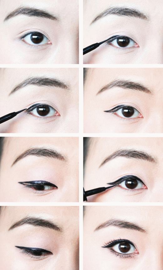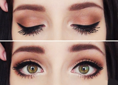 Если вам требуется, чтобы расстояние между глазами казалось более узким, прибегайте к такой уловке: на всю длину чертите линию на глазе. Её нужно провести поближе к переносице. Там, где растут ресницы, проводите черту четко. На нижнем веке можете рисовать стрелку с внешней его стороны.