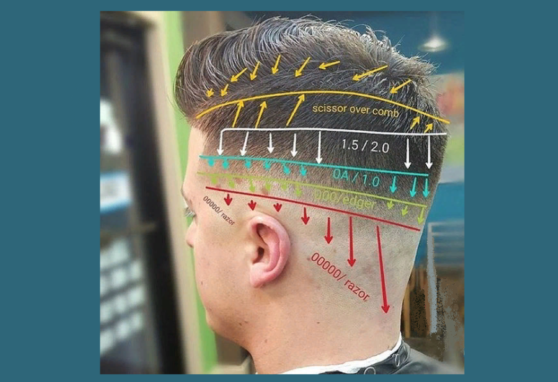 - Начинают стрижку с височных областей, снизу используют минимальную насадку машинки, потом переставляют вторую соседнюю по длине для создания постепенного уменьшения длины. Машинкой двигают против линии роста волос.