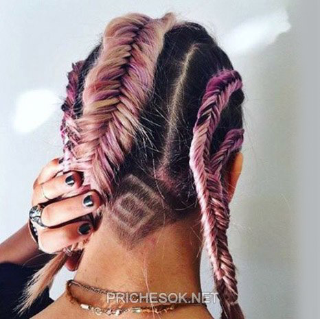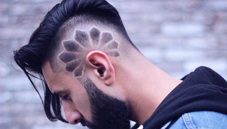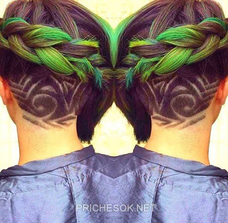- Для дерзких и креативных предлагается выбрить рисунок на выстриженных частях причёски. Особенно чётко рисунок виден на тёмных волосах. Чтобы он всегда был аккуратным, придётся часто его корректировать.