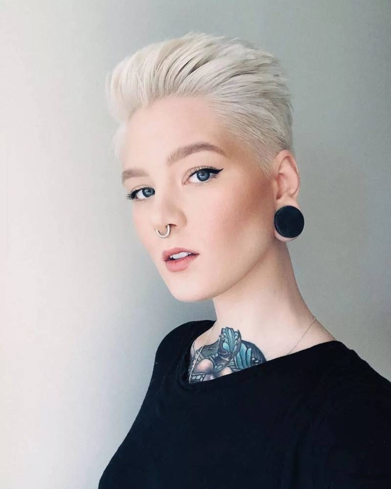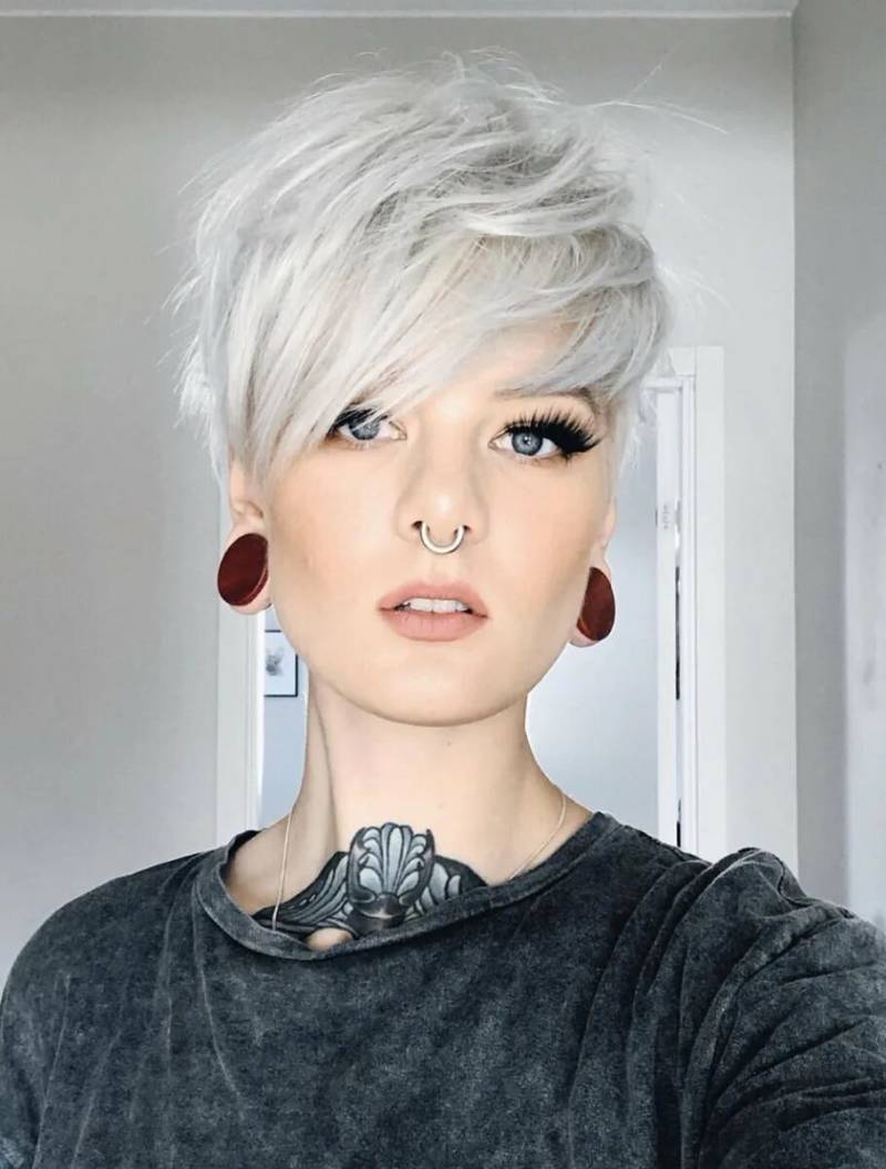 Чтобы сделать затылок и виски достаточно короткими, можно применить ножницы или же сделать это под машинку, при этом уставив насадку 2 или 3, таким образом, вам удастся достигнуть более контрастный результат. Можно сделать пряди разной длины, чтобы улучшить эффект укладки. Естественно, чем длиннее пряди, тем больше возможностей сделать нужную укладку, в том числе и с начесом назад.