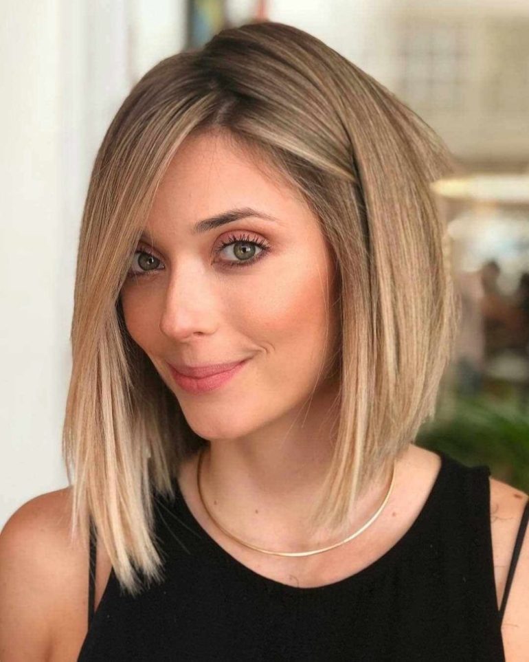 Она слегка обозначена плавным переходом в передние пряди. При этом на затылке волосы намного короче. Такое каре – отличный вариант, чтобы скрыть скулы или визуально сузить овал лица.