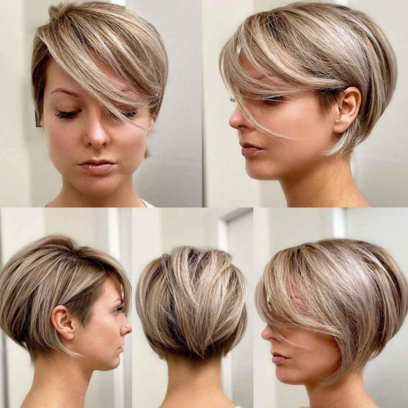 Пикси боб имеет характерные отличия – короткие волосы на затылке и объем на макушке и темени. Передним локонам оставляют желаемую длину, обычно она достигает мочки уха. Пряди возле лица стригут, используя технику градуировки.