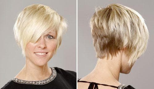 Боб эффектно смотрится на короткой длине: сзади, на затылке, волосы подстрижены очень коротко, иногда даже выбриты, а на макушке собран основной объем. Спереди локоны удлиненные, красиво подчеркивают овал лица.