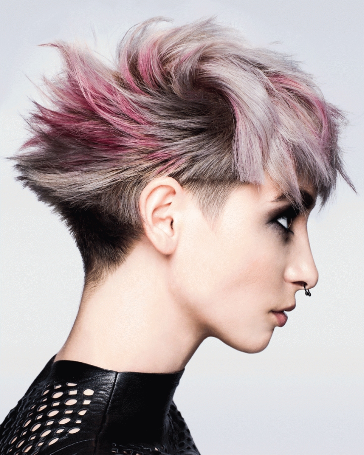 - с выстриженными висками (в т. ч. с мелированием и асимметричным окрашиванием прядей в яркие тона);