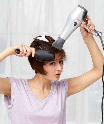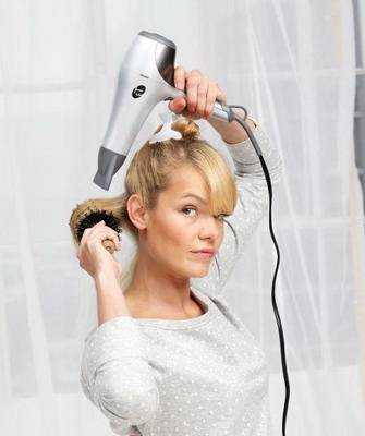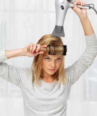 - Высушите шевелюру при помощи фена и круглой щетки, создавая объем у корней.
