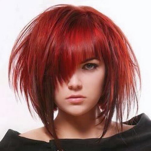 Нестандартная, немного странная, но очень модная прическа благодаря оформлению челочки под заостренным углом. Такая креативная прическа преобразит смелых девушек с послушными волосами.