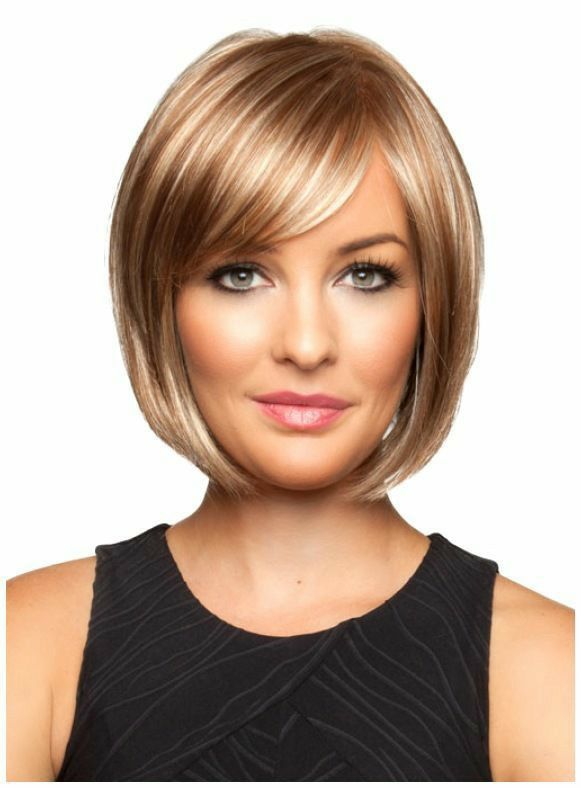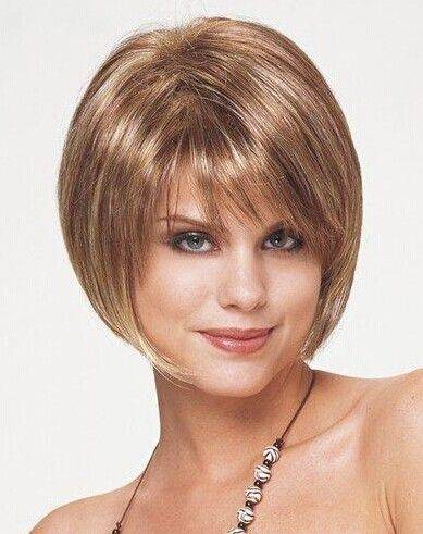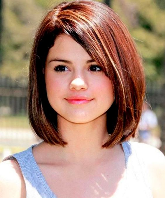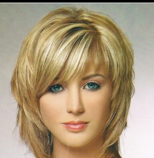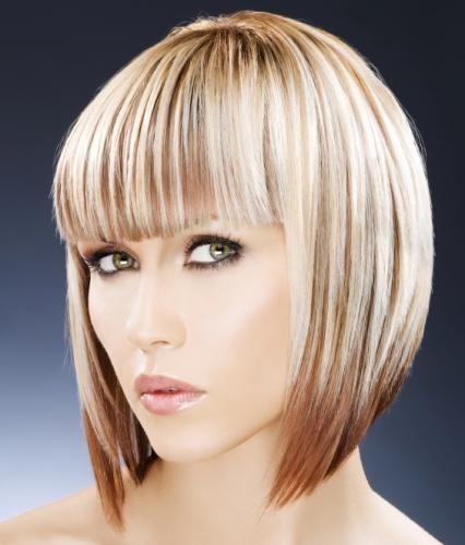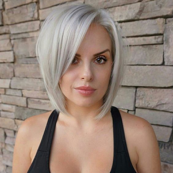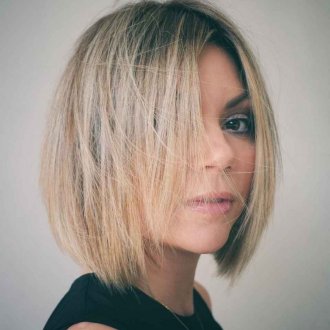 Скошенный срез фронтальных волос удачно корректирует ощущение грузности лица. Дамам с пухлым овалом круглой, квадратной, вытянутой формы рекомендуется делать прическу ниже подбородка. Дополнением стрижки становится длинная челка, скошенная набок.
