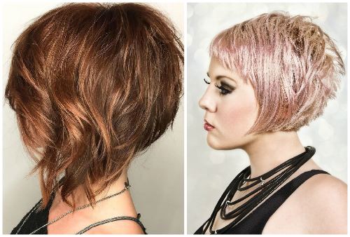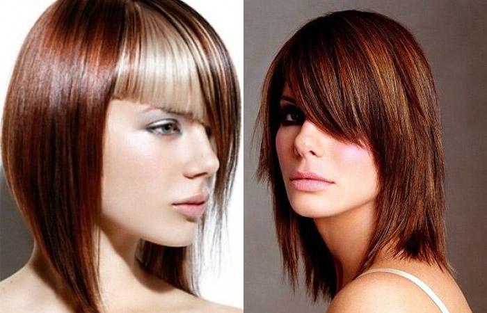 Стрижки с градуировкой, лесенкой или каскадом короткой, средней длины идеальны для зрелых женщин. Присутствие косых передних прядей поможет дополнительно затенить возрастные изменения на лице. Молодые девушки с помощью рваного контура подчеркнут дерзость. Длинная косая челка скроет возрастное несовершенство кожи.