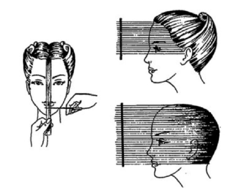 - Работу начинают с теменной пряди. Нужно отделить немного волос и зачесать их на лицо. Локон подстригают таким образом, чтобы он доходил до переносицы.