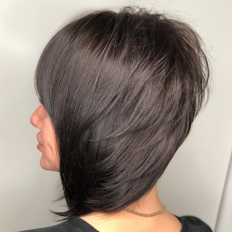 За счет коротких прядей в этой стрижке легко создать объем у корней, просушив волосы вниз головой, а пряди по длине вытянуть с помощью круглой щетки феном или утюжком.