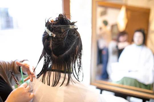 - Затем постепенно и небольшими прядями мастер переходит от челки к височным прядям, затем к затылку.