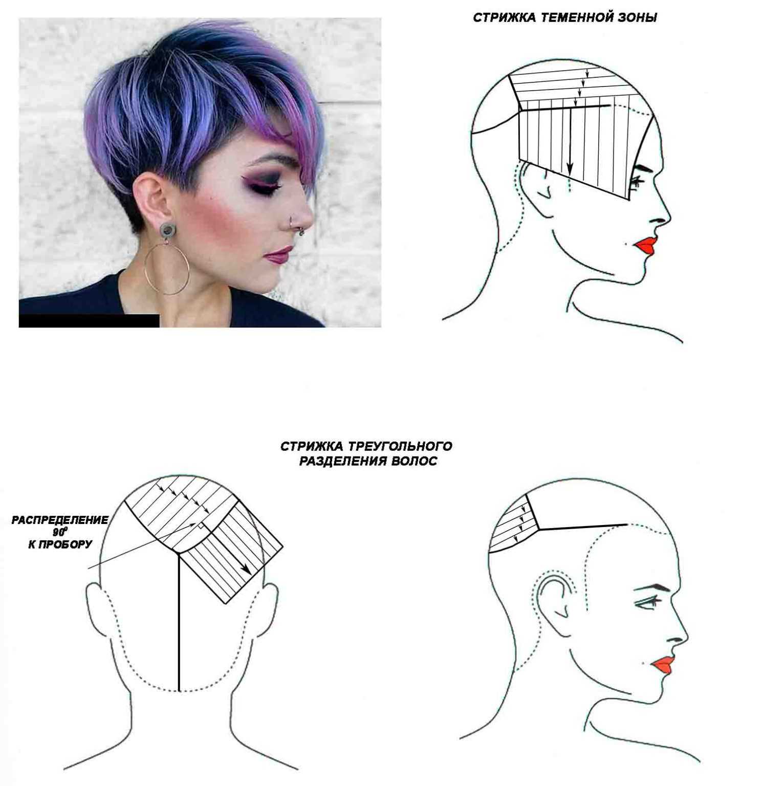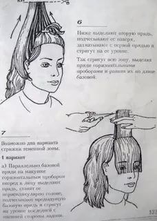 - Волосы расчесываются от макушки вниз, височно-боковые зоны отделяются вертикальными проборами.