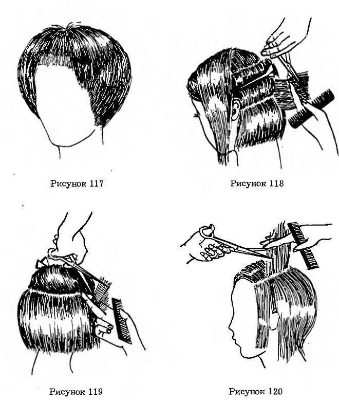 - Волосы фронтально-теменной и верхней затылочной зоны подстригаются ровным срезом вкруговую, от центра лба к середине затылка, ориентируясь на длину волос над ухом.