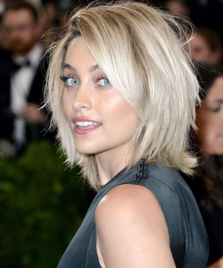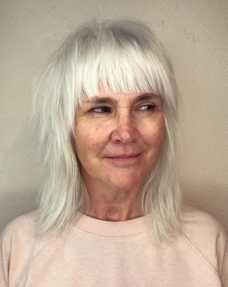 Transform your gray hair into an eye-popping silver blonde hairstyle with a straight brow-skimming fringe and chopped tresses, swooping down the shoulders.