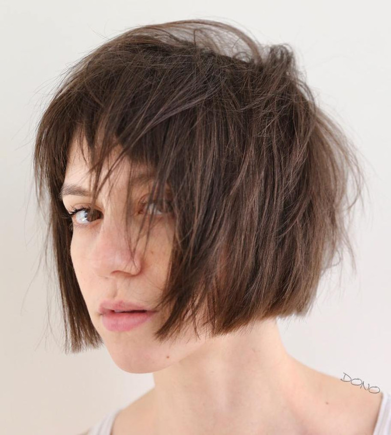 Opt for a “no frills” bob, which is handsomely textured and paired with jagged bangs to allow for easy, yet trendy styling.
