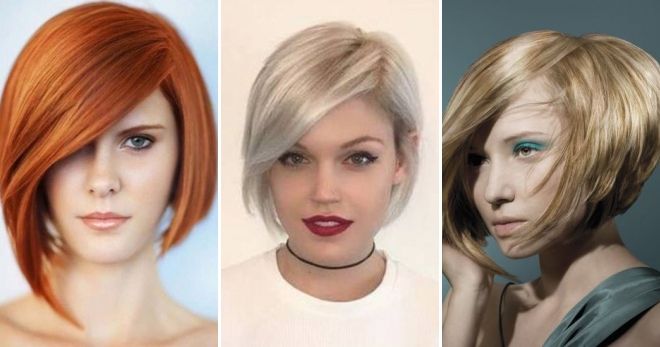 - С чёлкой. Обычно она имеет косой срез. Её делают на 3 – 5 см. больше длины прядей теменной зоны.