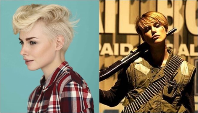 - Короткий томбой. Наиболее радикальный вид стрижки. В височной и затылочной зоне пряди имеют длину не более 10 мм, а чёлка и локоны теменной области – 5 – 8 см. Подобная модель максимально приближена к мужской причёске полубокс.