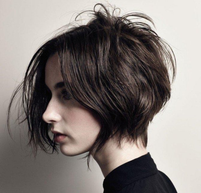 Эта разновидность прически берет за основу короткий «боб». Длина волос составляет не более 15–17 см. Принцип выполнения совпадает с предыдущим вариантом стрижки, за исключением равномерности прядей, которые по всей голове выходят разной длины.