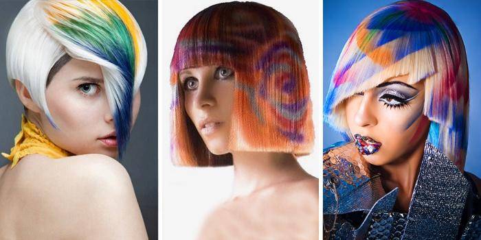 - Цвета радуги. Хотите выделиться? Выбирайте блочное окрашивание, применяемое на коротких волосах. От обычного оно отличается тем, что определенный цвет распределяется по выбранным участкам.
