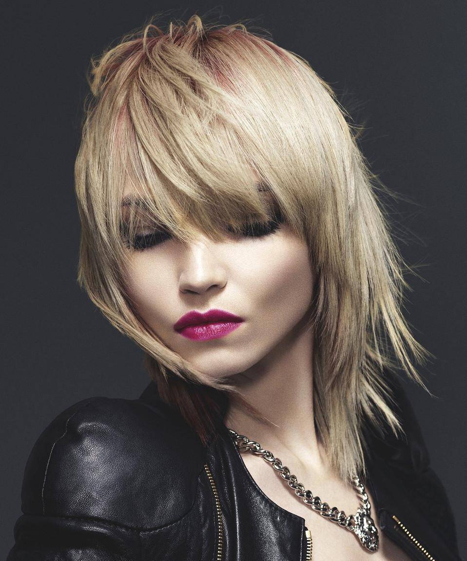 - К такой прическе прекрасно подходят разнообразные виды челки, которые придают нотку индивидуальности и оригинальности. Наиболее выгодно смотрится челка, длиной до линии бровей, слегка прореженная. Стилисты не советуют останавливать выбор на очень густых челках, так как они не всегда выигрышно смотрятся с рваными прядями. Интересно и стильно смотрится косая челка, которую нужно укладывать на один бок – может быть различной длины (очень длинная либо короткая). Идеальным выбором будет асимметричная челка, благодаря чему «волчица» выглядит более интересно и стильно.