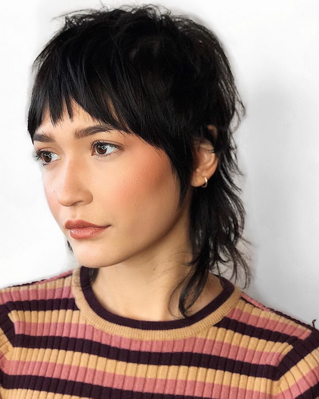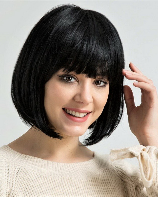 В этом примере стрижка завершается густой челкой, которая обрамляет лицо и скрывает лоб.