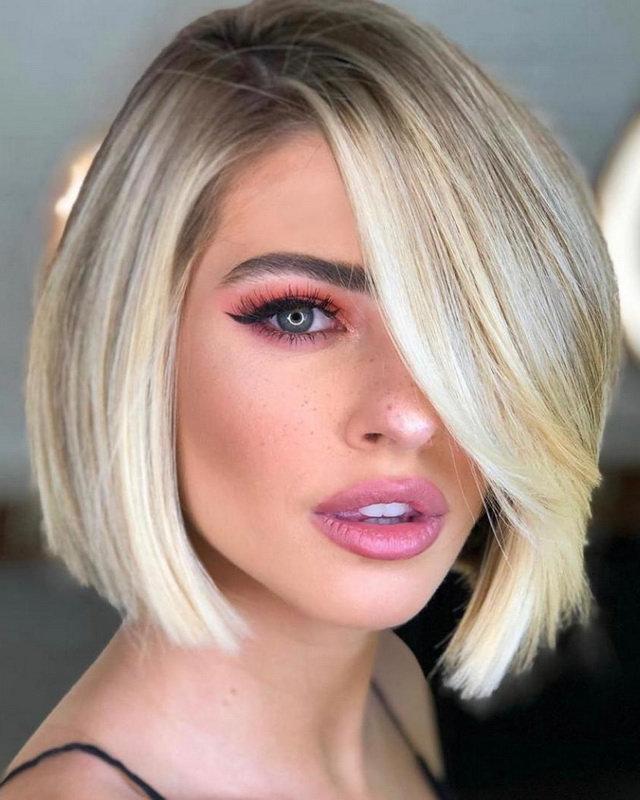 Гладкое и женственное асимметричное каре – одна из самых лестных причесок для маленьких лбов и мелких лиц.