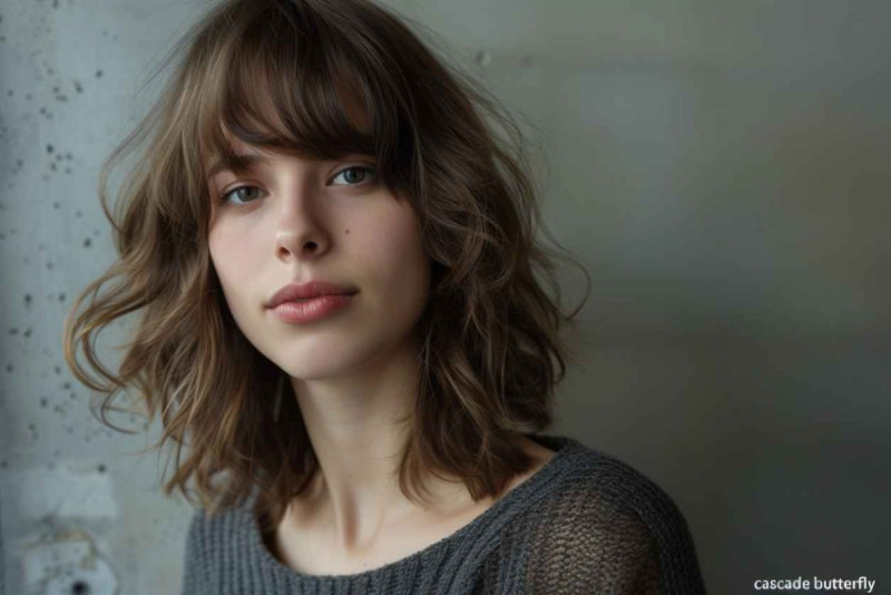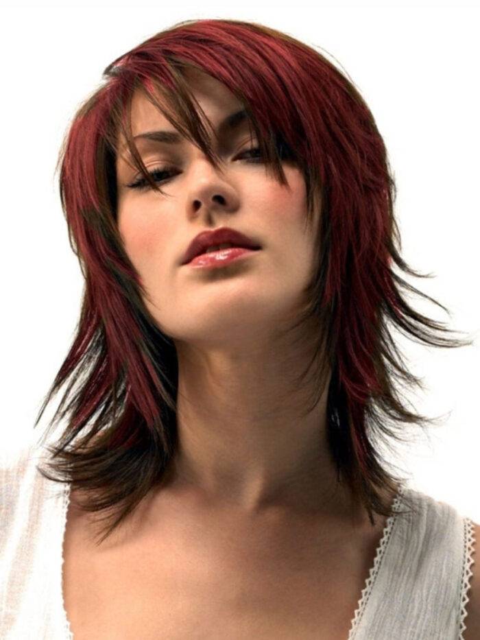 Воплотить женственный образ поможет прическа «каскад» или «бабочка». Ее особенность заключается в многоуровневом выстригании прядей. Верхний слой может начинаться в области челки. Ее делают удлиненной, доходящей до уровня скул.