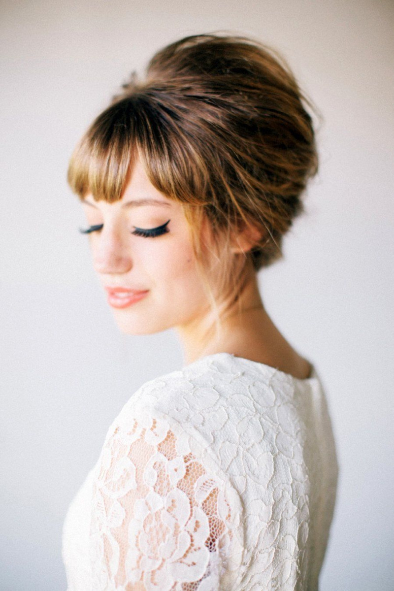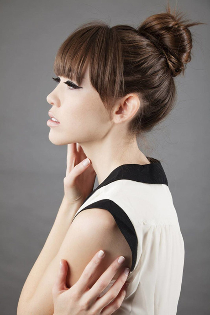- пучок – лучше если волосы будут идеально зачесаны и зафиксированы. Не стоит сочетать прямую ровную челку с объемными воздушными пучками. В такой прическе прослеживается дисбаланс.