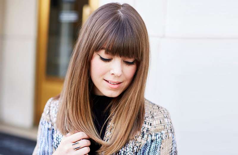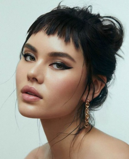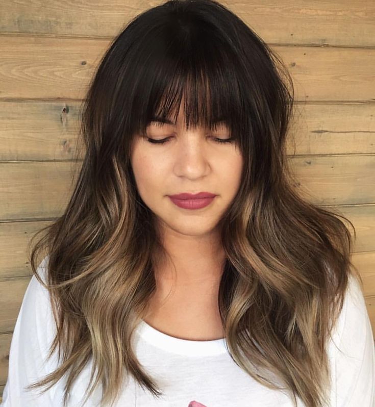 Если пряди достигают до плеч или опускаются ниже, попробуйте освежить образ, добавив корейскую челку. Это современный вариант: она не ложится густо, сплошной плотной линией, а немного прореживается, филируется и распрямляется. При этом боковые пряди длиннее, чем основная масса.