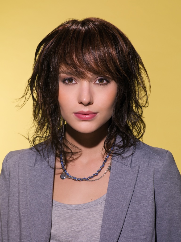 Средняя длина волос позволяет играть с короткой челкой: она может быть прямой, густой, уложенной набок, немного небрежной, подкрученной. Короткие челки советуют носить обладательницам ровного тона волос, без переходов цвета, а именно блондинкам и брюнеткам. В первом случае вы придаете образу озорства, во втором — глубины и загадочности. Истинный тренд этого сезона — рваная челка. Настоящий парикмахерский бум на фасон вполне объясним — с ее помощью можно визуально помолодеть на несколько лет, особенно если отдать предпочтение многослойной прическе.