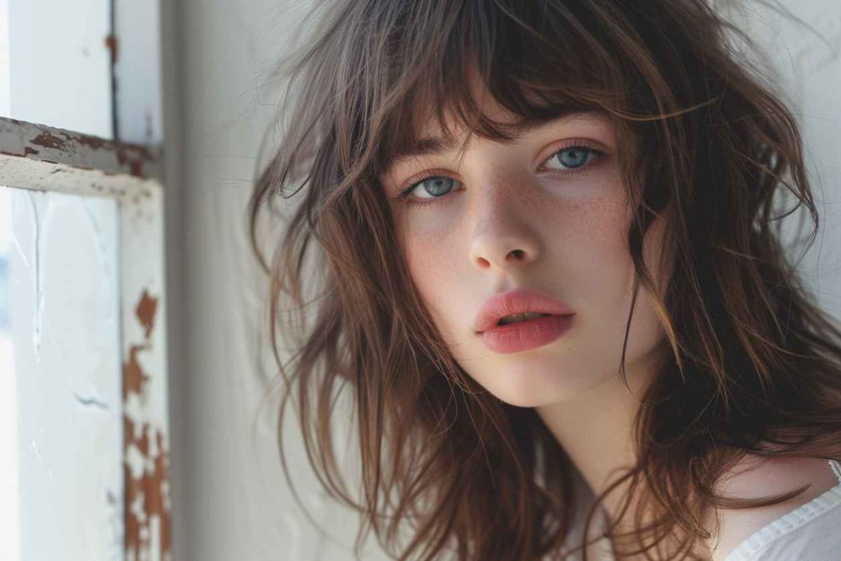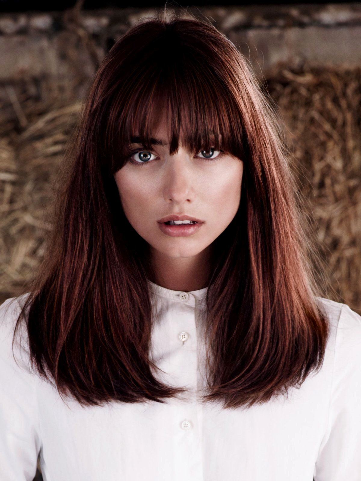 Если пряди достигают до плеч или опускаются ниже, попробуйте освежить образ, добавив корейскую челку. Это современный вариант: она не ложится густо, сплошной плотной линией, а немного прореживается, филируется и распрямляется. При этом боковые пряди длиннее, чем основная масса.