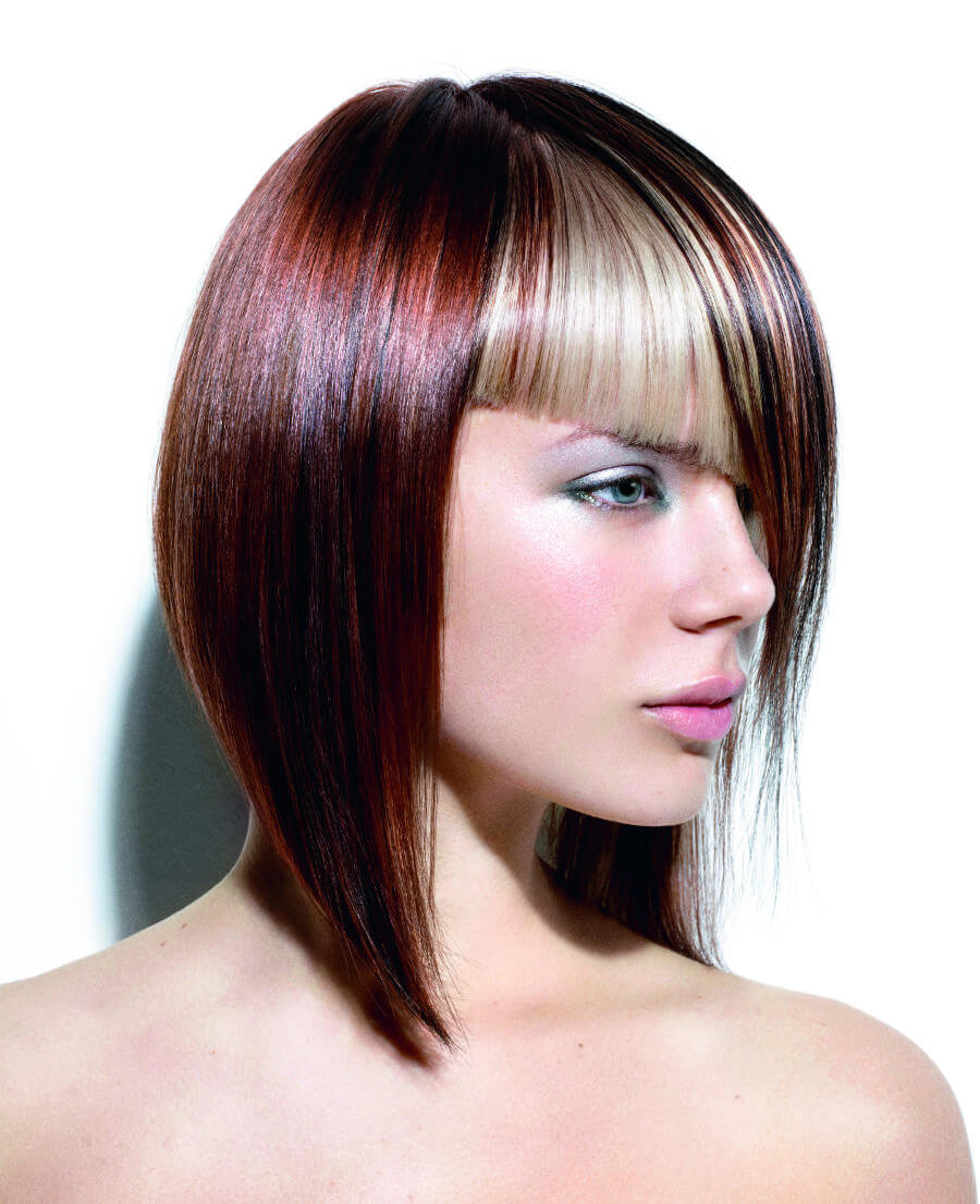 Асимметричный боб предлагается подчеркнуть косой челкой, спадающей на одну сторону. Этот прием дополнительно подчеркивает асимметрию и делает на ней акцент.