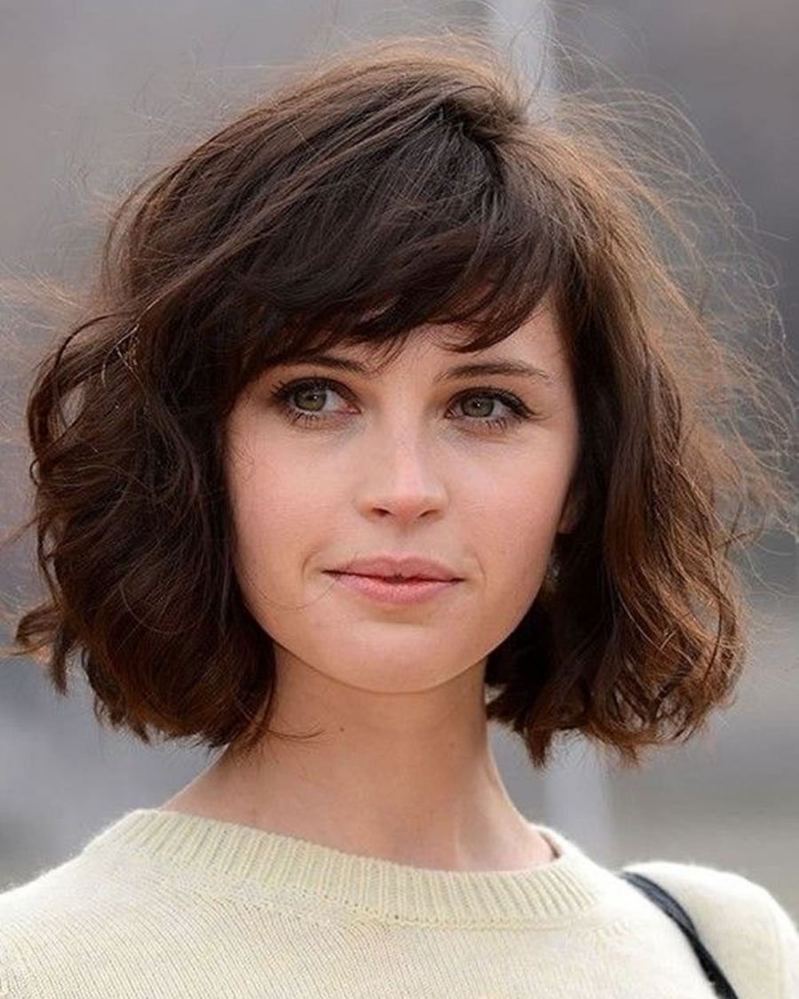 Стрижка будет отлично сочетаться с не длинной челкой набок или небрежной удлиненной челкой с пробором.