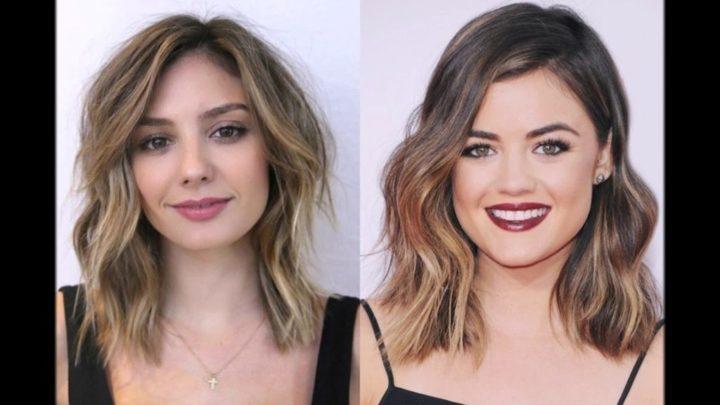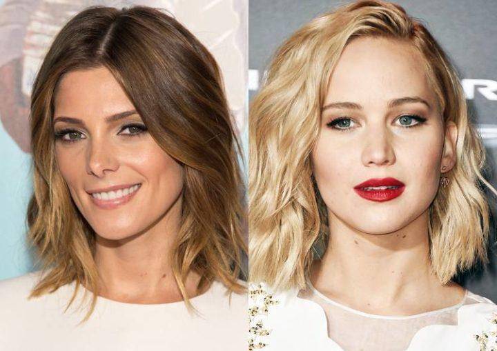 Для коротких волос прекрасно подойдет боб, который допускается делать в любой интерпретации, в том числе и асимметрию. Также хорошо будут смотреться легкие пляжные волны и стрижка шегги. Лесенка, где будут четко выделены пряди, обрамляющие лицо, помогут лучше всего смягчить острый подбородок и скроет скулы.